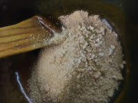 6. Other way, is to melt jaggery on low heat by adding 1 tsp water. Immediately switch off the flame once it's completely melted. Add in sesame powder, cardamom powder and chopped cashews. Add 1-2 tbsp ghee and make small sized ladoos.